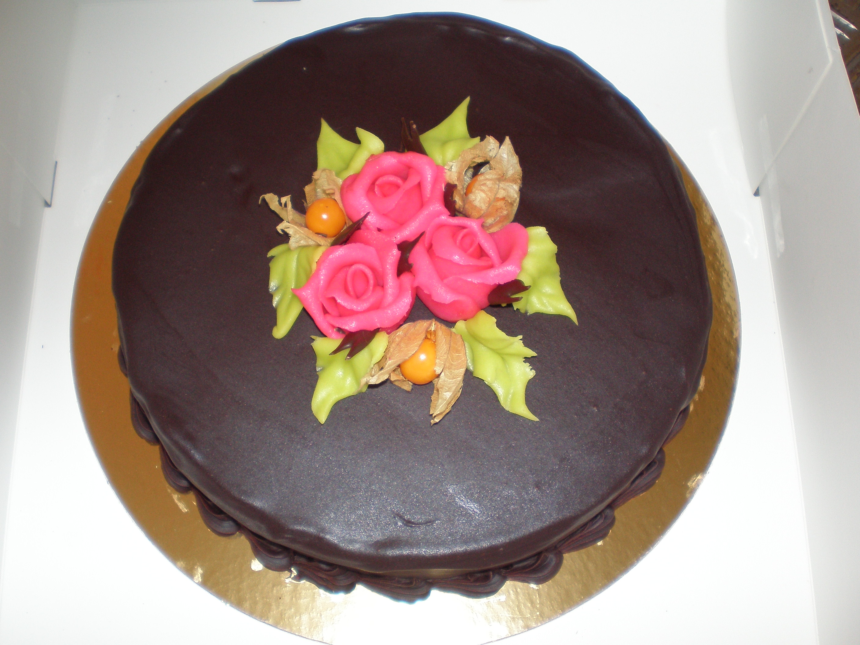Súkkulaðiterta með súkkulaðihjúp og marsipanblómum